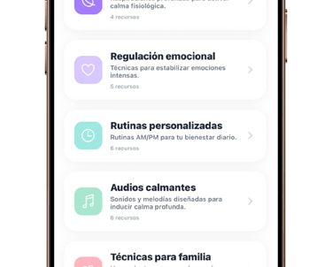rutinas AM y PM, respiraciones visuales y técnicas de relajación adaptadas a distintos momentos.