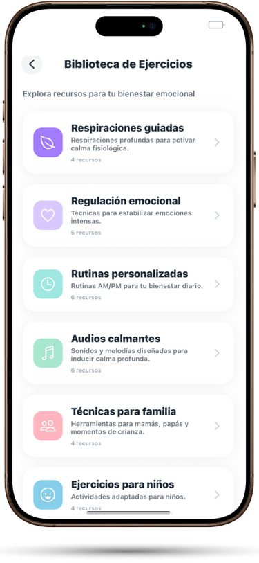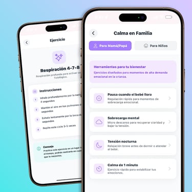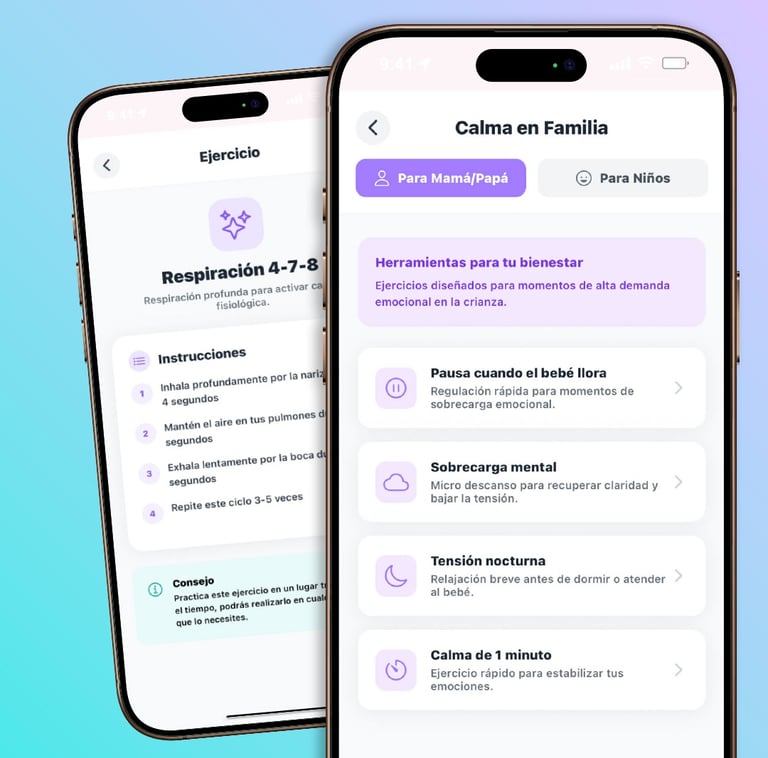 A través de ejercicios breves, respiraciones guiadas, rutinas emocionales y herramientas prácticas, CalmPoint te acompaña cuando más lo necesitas: cuando el bebé llora, cuando el día pesa, cuando la mente no se detiene o cuando un niño necesita aprender a calmarse.